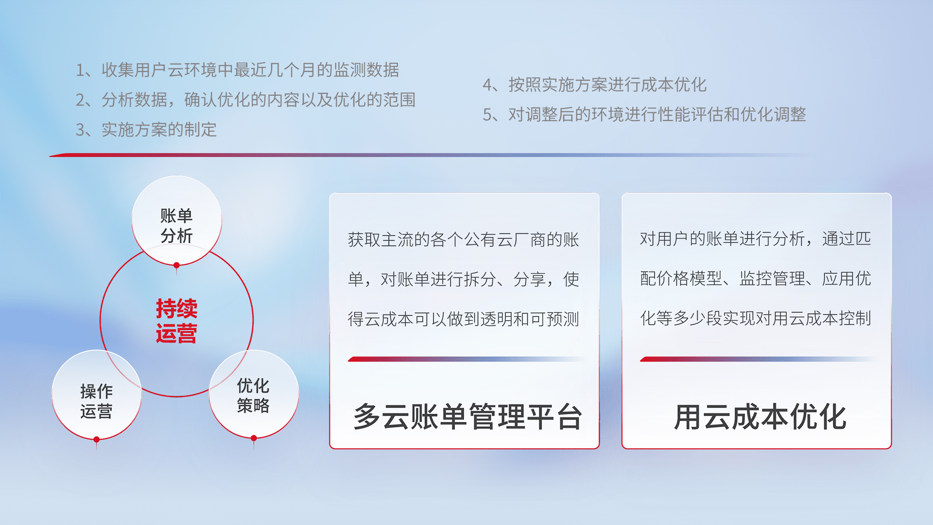 通过多云纳管,,以统一的资源数据模型把客户的云资源进行抽象和封装,,,进而实现对多云资源的统一操作,,,,保障云资源管理的可靠性、、、、稳定性与可用性。。。量身定制化运维内容,,,配置、、开发运维、、补丁管理、、备份、、、监控、、、认证和访问管理、、、审计和日常巡检等,,,保障在用云过程中的可靠度,,稳定度以及高可用率。。。
